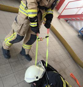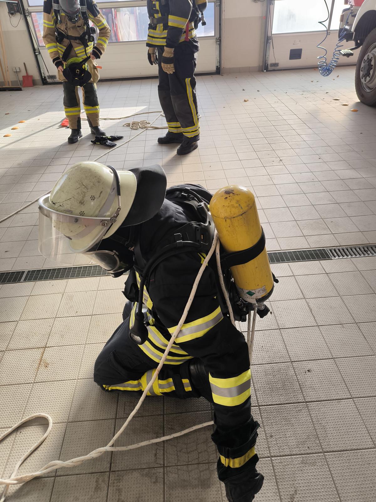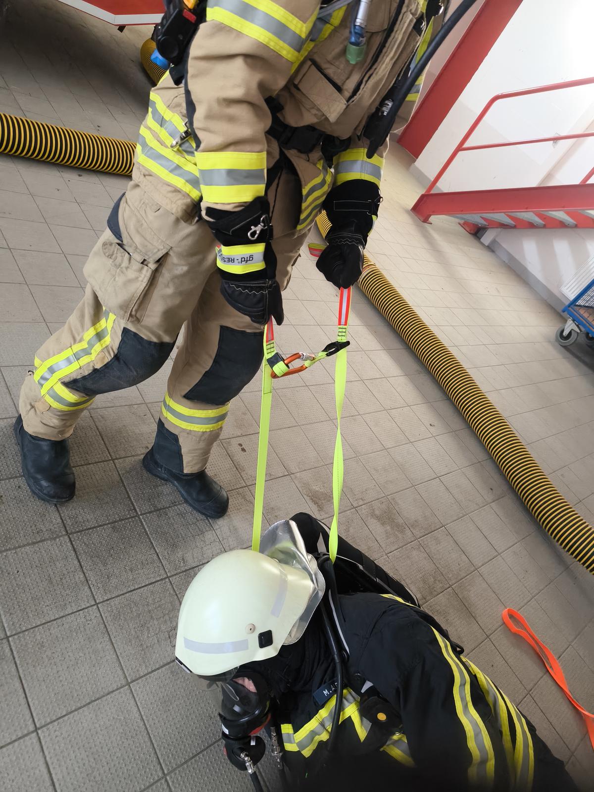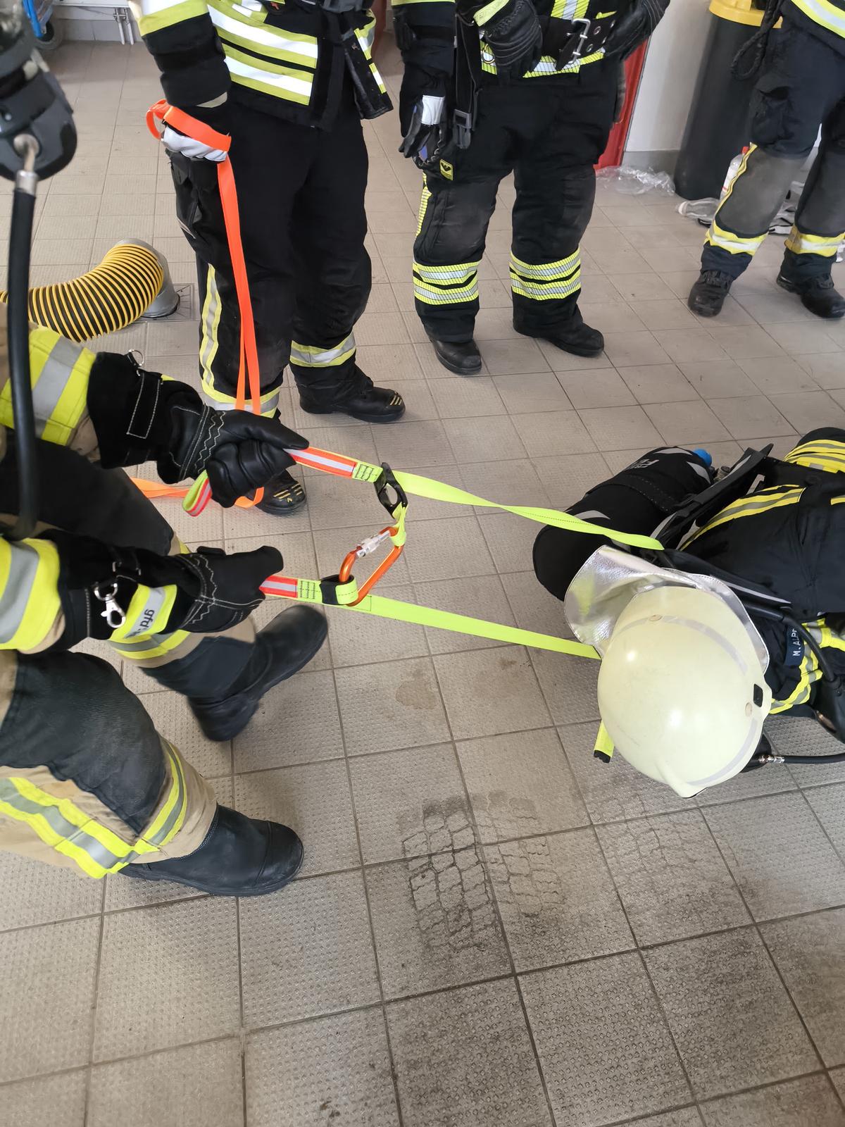 Im praktischen Teil beschäftigten wir uns dann mit angelegtem Atemschutz und Nullsicht, zunächst darum, wie man sich selbständig aus einer Lage befreien kann, bei der man sich z.B. mit einem Seil verheddert hat. Dies ist mit (z.B. Rettungsmesser) und auch ohne Hilfsmittel (z.B. Ruderbewegung) möglich. Wichtig dabei ist immer, nicht in Panik zu geraten. Desweiteren übten wir verschiedene Szenarien zum Thema “keine Luft”. U.a. übten wir das Flaschenventil selbst wieder aufzudrehen und wie wir uns innerhalb eines Trupps verhalten sollen, wenn der Lungenautomat ausfällt oder tatsächlich die Atemluftflasche leer ist. Hier käme dann nur das ständige Tauschen des noch funktionierenden Lungenautomats vom anderen Truppmitglied in Frage, vorausgesetzt die Atemschutzgeräte sind miteinander kompatibel (Normaldruck/Überdruck) und Luftvorrat ist noch ausreichend vorhanden. Weitere Möglichkleiten (u.a. mitgeführte Fluchthaube, Y-Stück) zur schnellen Rettung eines Truppmitglieds wurden erörtert. Zu guter Letzt wurden noch verschiedene Rettungstechniken mit der Bandschlinge gezeigt, um einen Atemschutzgeräteträger aus einem Bereich herauszuziehen.