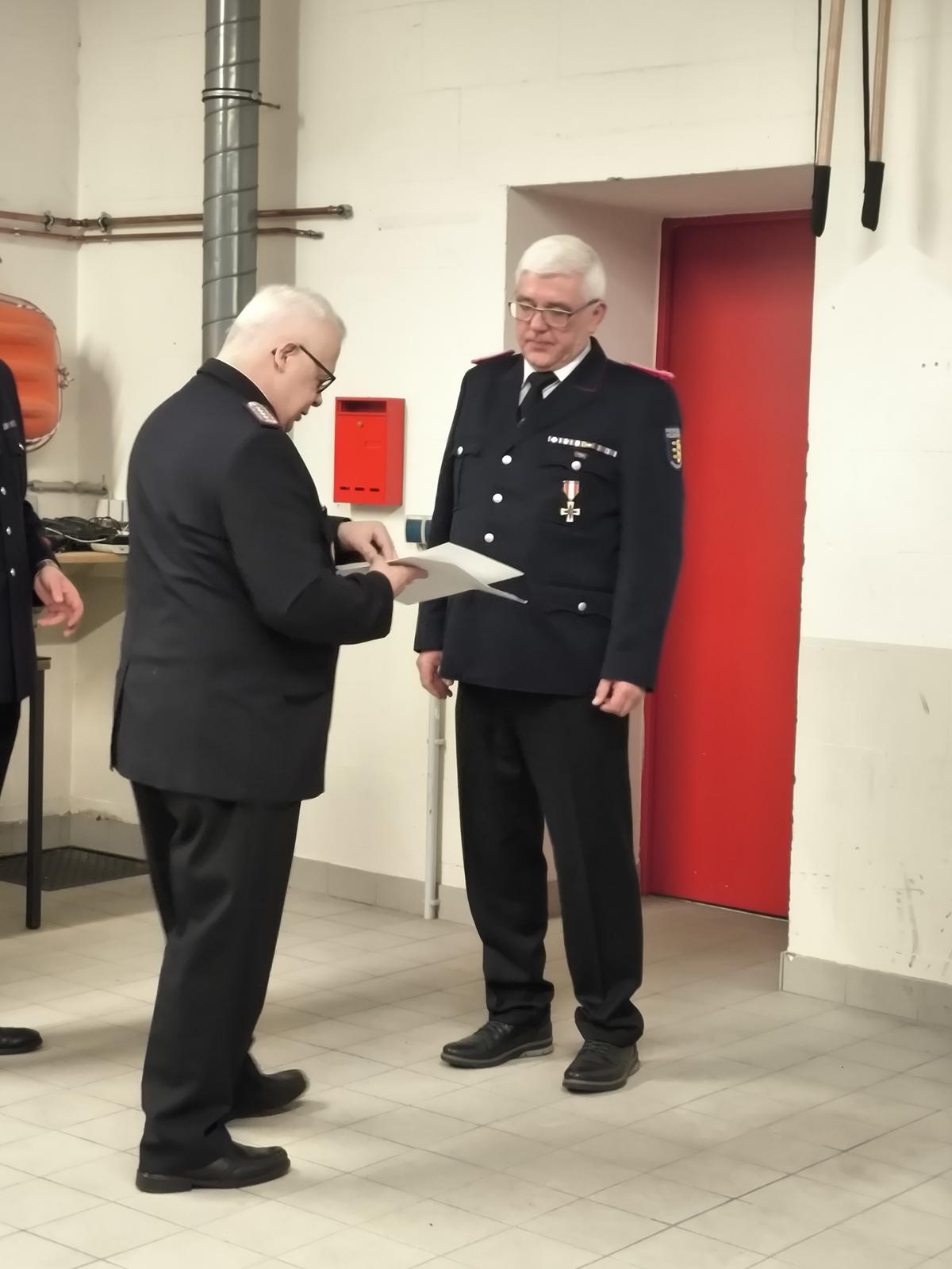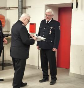 Jürgen Berodt wurde vom Amtswehrführer für seine 50-jährige Mitgliedschaft im aktiven Dienst mit dem Brandschutzehrenzeichen (am Bande) in Gold geehrt.
