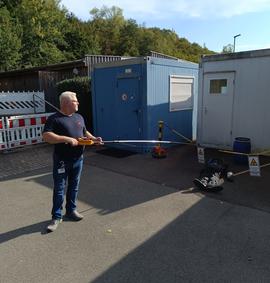 1) Löschangriff (FwDV3): Standrohr setzen, 2 Strahlrohre, Bälle ins Tor schießen, Theorie