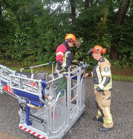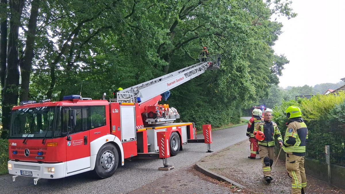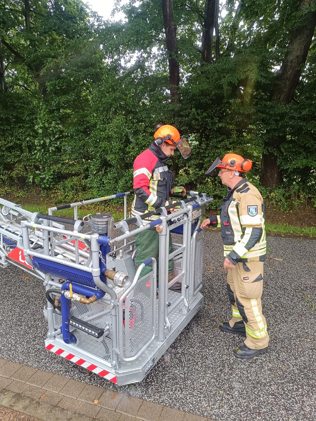 Nach dem Eintreffen der Drehleiter der FF Geestacht, wurde diese in Stellung gebracht und der Ast per Motorsäge aus dem Korb abgesägt.