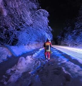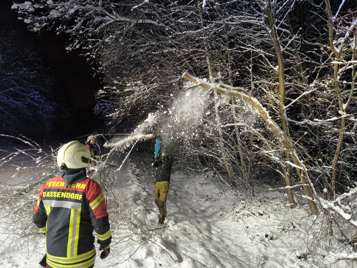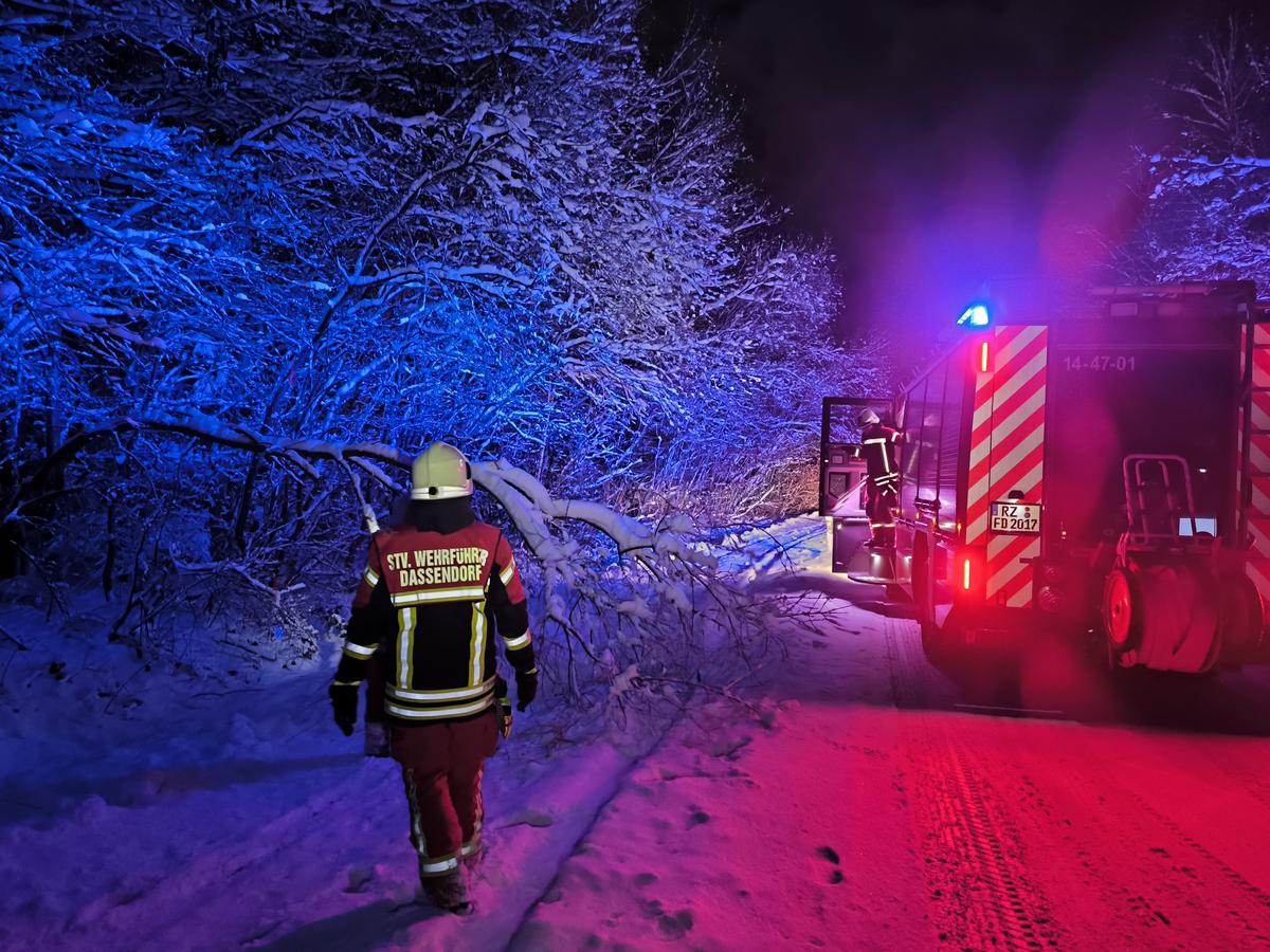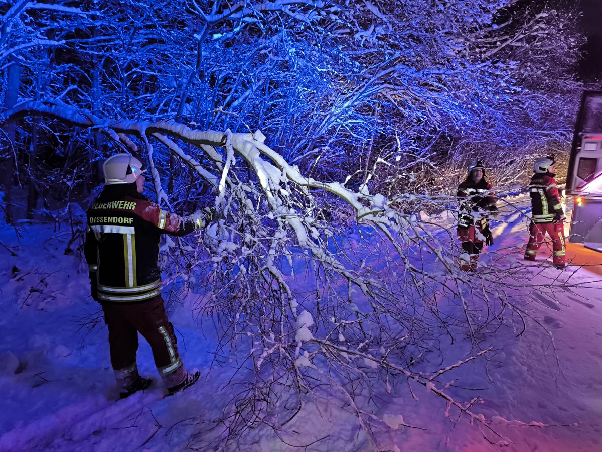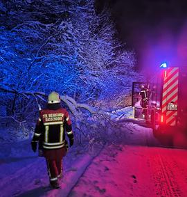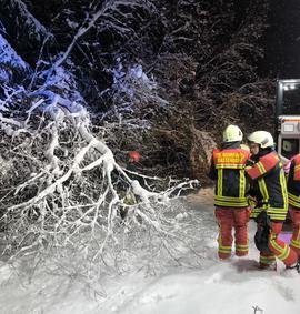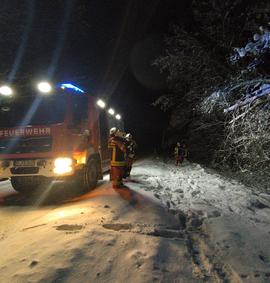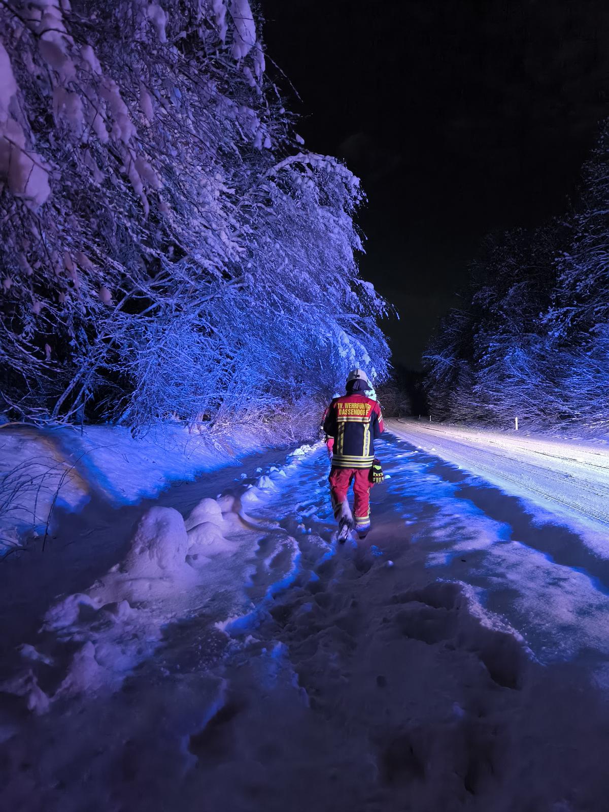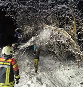 Erneut wurden wir am späten Abend zu einem durch die Schneelast umgestürzten Baum auf die L314 alarmiert. Es waren dann bei Ankunft am gemeldeten Einsatzort nur einige kleine Bäume/Äste, die durch die Schneelast auf die L314 ragten. Zwei Bäume/Äste mussten wir fällen und zur Seite räumen. Bei einigen weiteren reichte es aus die Schneelast abzuschütteln, so dass sie sich wieder aufrichten konnten.