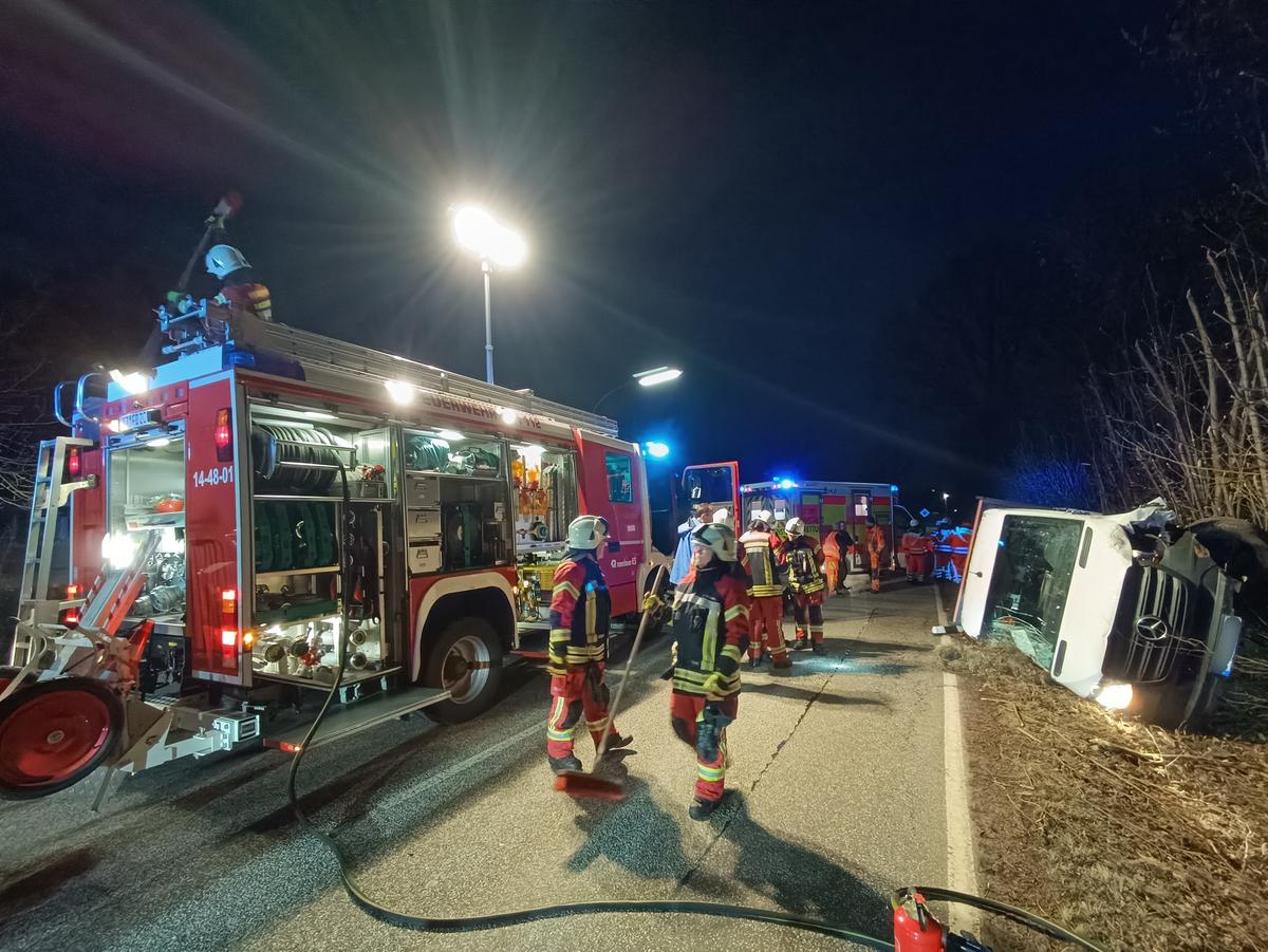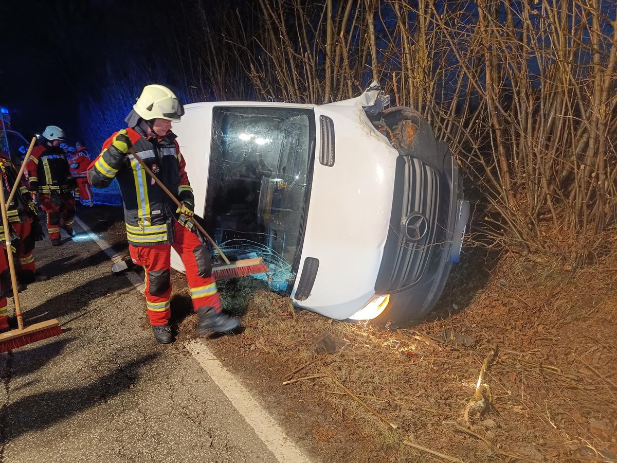 Der Rettungsdienst übernahm die Versorgung der nur leicht verletzten Patienten. Wir leuchteten die Einsatzstelle aus, stellten den Brandschutz sicher und fegten anschließend die Straße. Die nahezu gleichzeitig eintreffende FF Hohenhorn konnte vorzeitig aus dem Einsatz entlassen werden. Der Fahrer des Transporters soll einem Reh ausgewichen sein und dabei die Kontrolle verloren haben. Während des Einsatzes und der späteren Fahrzeugbergung war der Mühlenweg gesperrt.