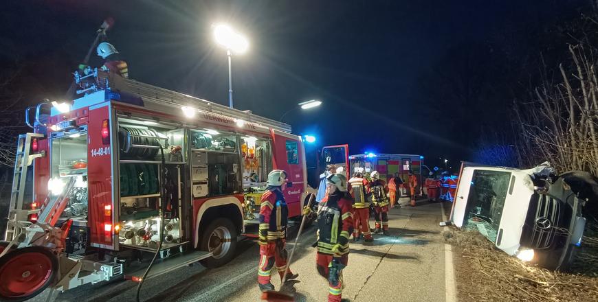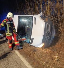 Ein verunfallter Transporter im Mühlenweg gab Anlass zur Alarmierung. Die Einsatzmeldung verhieß nichts Gutes, da die Rede von drei Personen war, die im Transporter eingeschlossen waren. Bei der Ankunft des erst eintreffenden Fahrzeuges, unserem HLF, waren die Personen (nur zwei) jedoch schon selbstständig aus dem Transporter geklettert.